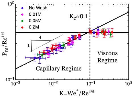 The results from both regimes can be collapsed in an impact phase diagram controlled by two variables, the maximum spreading factor P_m, given by the ratio of initial to maximum drop radius, and the impact number K = We*/Re^(4/5), which scales with the effective Weber number We* as well as the Reynolds number Re. The data exhibit a transition from capillary to viscous behavior at a critical impact number Kc ~0.1, as shown below.