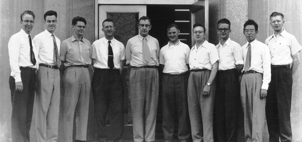 Spring 1952, after a Monday night seminar in Smith's office. From left to right: Nicholson, Walnut, Keeffa, Gibbons, Smith, Raynor, Snow, Boulanger, Kubo, and Schulz